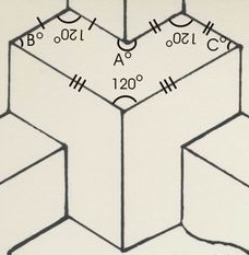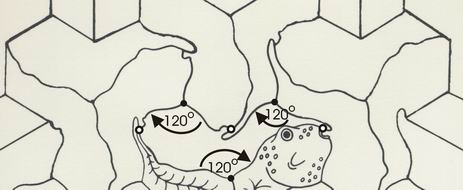 To see why the resulting figure tessellates, imagine rotating the shape about any of its 120 degree vertices. Since 3 times 120 degrees equals 360 degrees, exactly three such shapes will fill up all the space around any such vertex. Now how about the other three vertices? You will see that the total angle around each of the non-120 degree vertices is equal to A+B+C. But the internal angles of any hexagon sum to 720 degrees, and since we have already used up 360 degrees with the three 120 degree angles, A+B+C must also equal 360 degrees. Hence the space is filled at the other three vertices. Once you have a tessellating hexagon, you can replace the straight lines with curves that are duplicated and rotated 120 degrees.